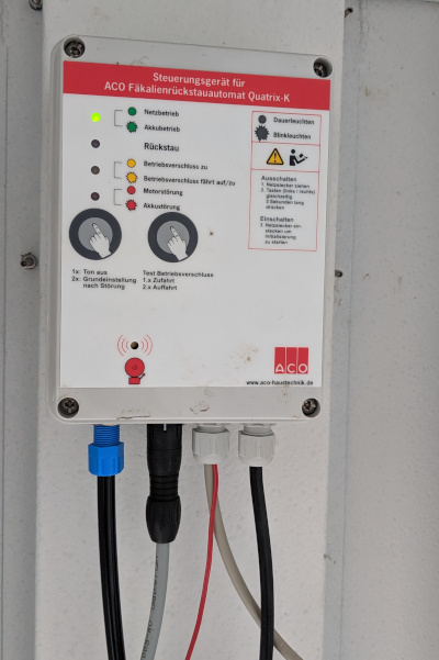 Während die Klappe geschlossen ist, ertönt an der Steuerung ein Summer als Warnung, dass kein weiteres Abwasser eingeleitet werden sollte. In der Abwasserleitung bis zur Absperrklappe ist zwar noch eine gewisse Reserve, aber irgendwann ist auch die voll (zum Hände waschen sollte es gerade noch reichen ;-)). Die Steuerung mit Warnsummer befindet sich in meiner Garage, und solange ich nicht zufällig auch dort bin, höre ich den Warnton nicht.